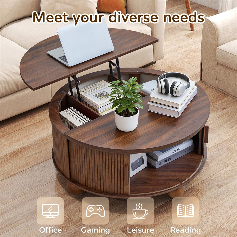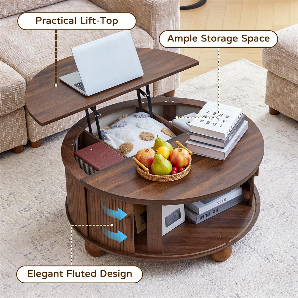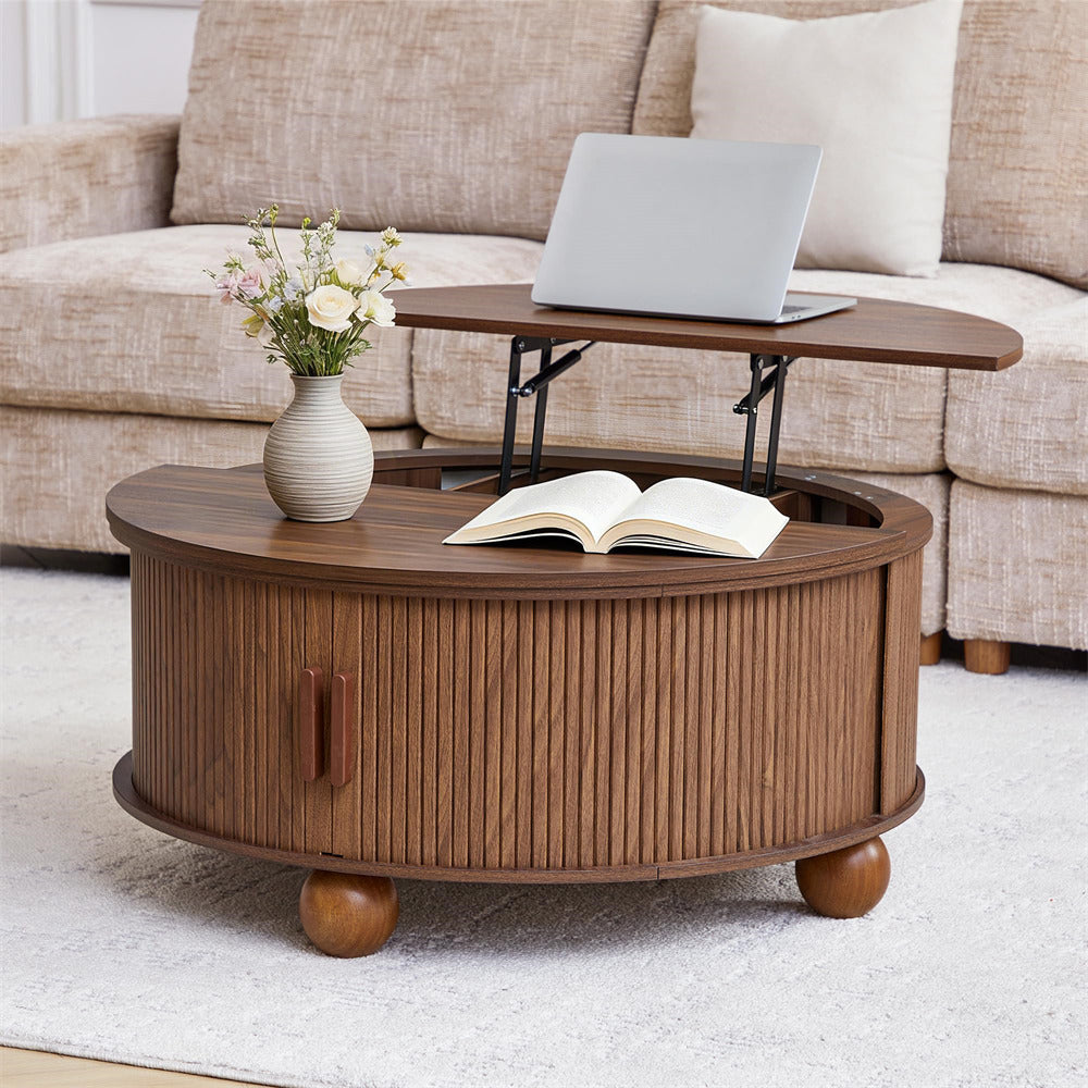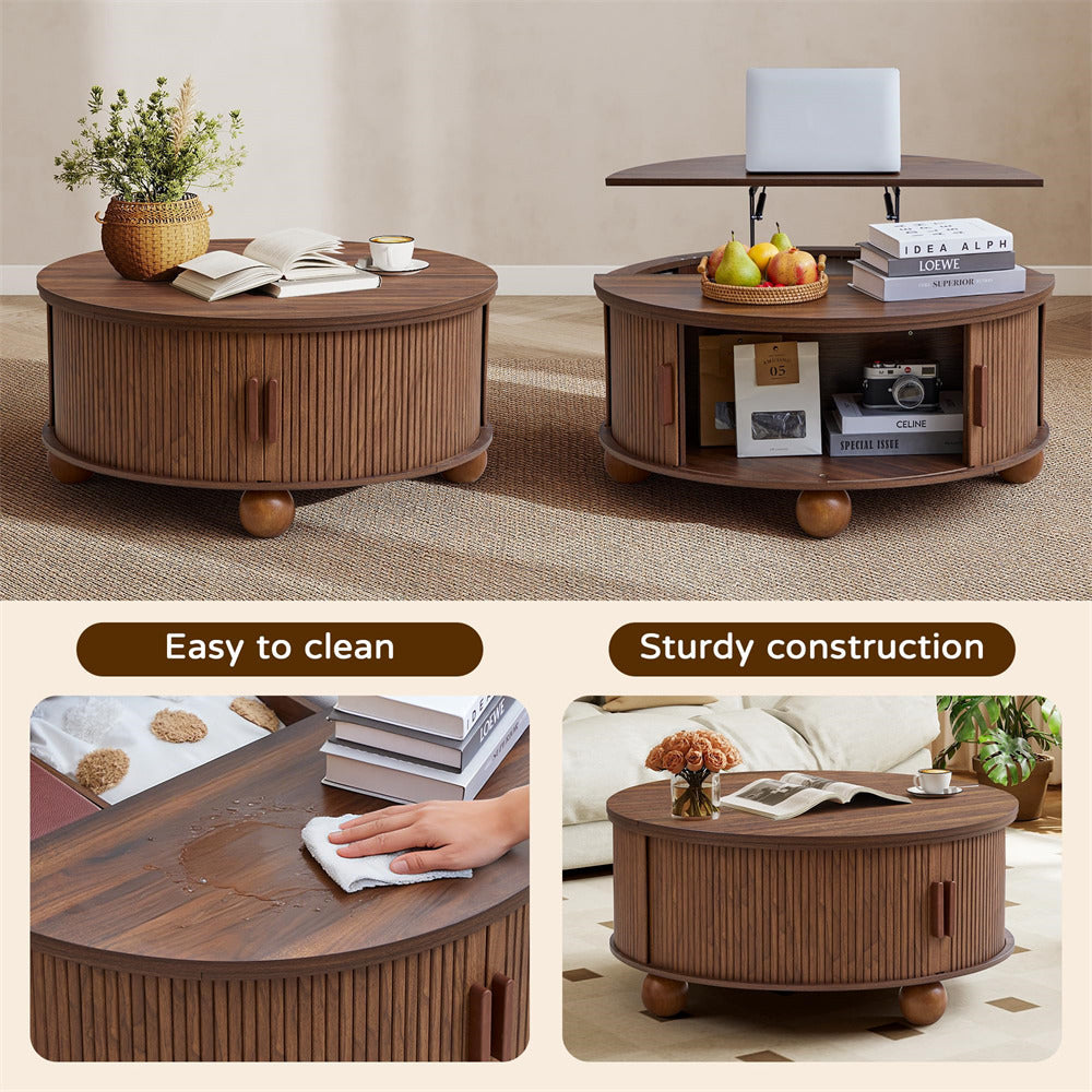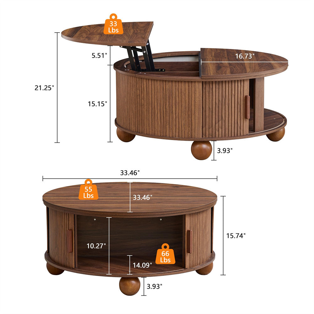 Sturdy & Durable: Crafted from premium medium-density fiberboard with a finely sanded, smooth finish, this round lift-top coffee table features spherical legs and reinforced support bars behind the sliding doors for enhanced stability. The base supports up to 66 lbs, the fixed tabletop holds 55 lbs, and the lift-top surface accommodates 33 lbs.