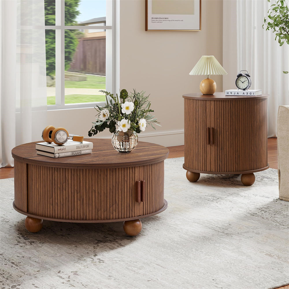Unique Design: Innovative details like sliding doors, recessed grooves, and spherical legs make this wooden drum-shaped coffee table a focal point in your living room while fostering a warm ambiance.