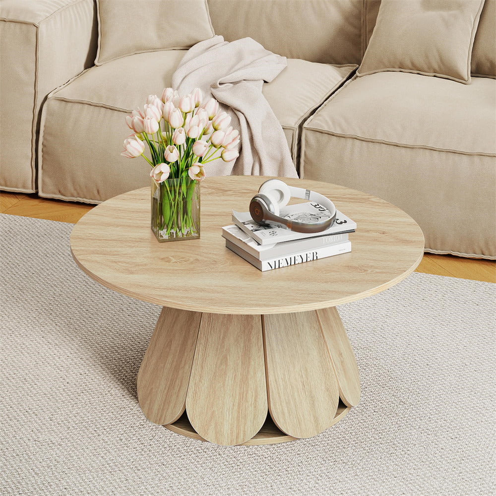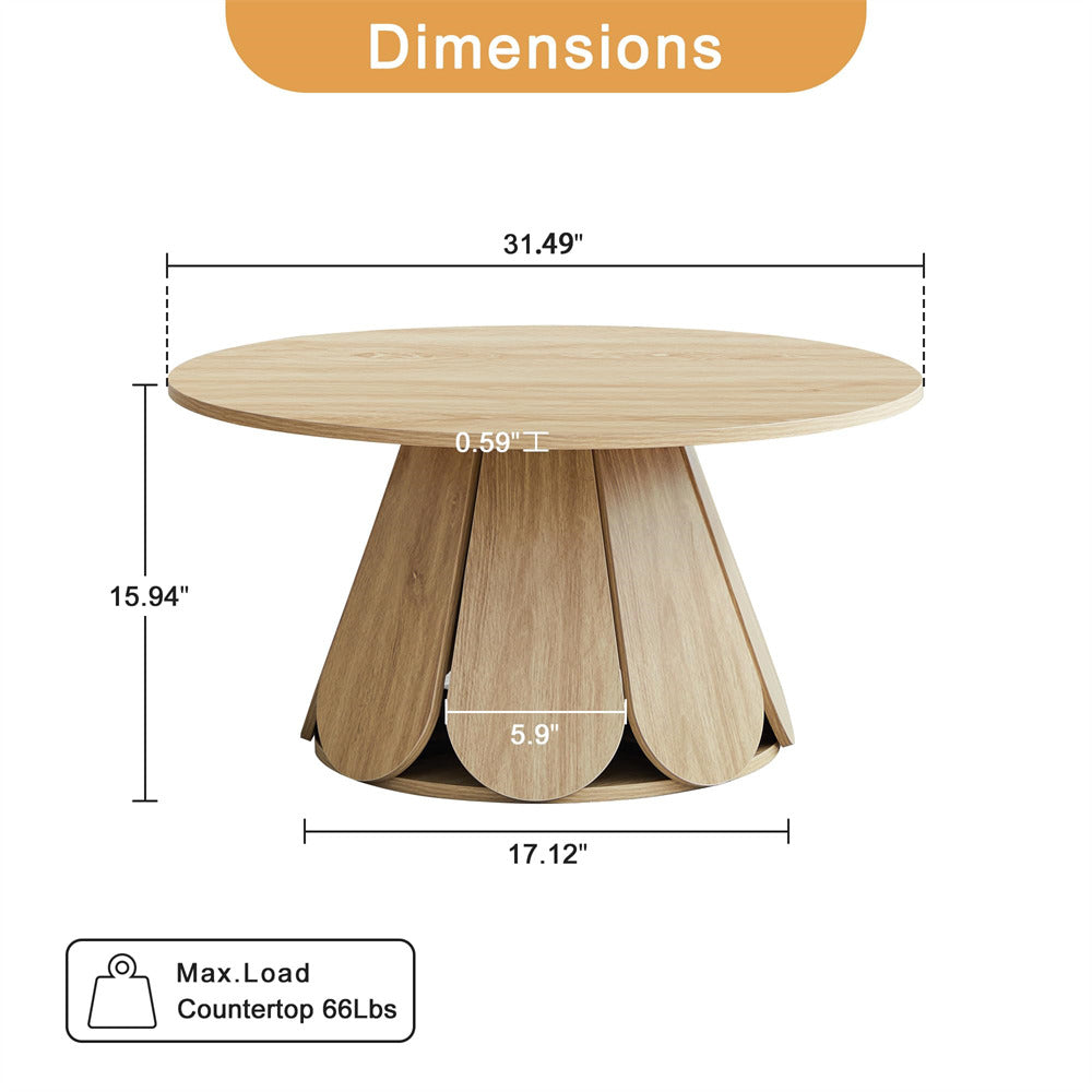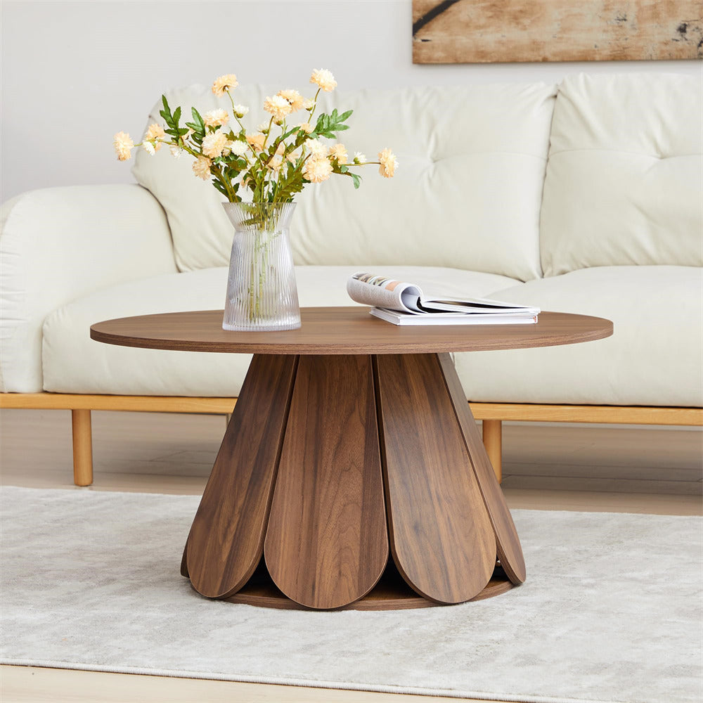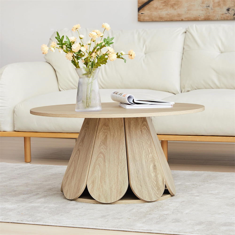 Elegant Coffee Table: Boasting a sleek, minimalist circular design with a striking petal-shaped table base, this modern rustic-inspired coffee table merges contemporary elegance with a warm, natural aesthetic. The substantial base offers steady and wobble-free support to the tabletop, lending overall sturdiness to the table.