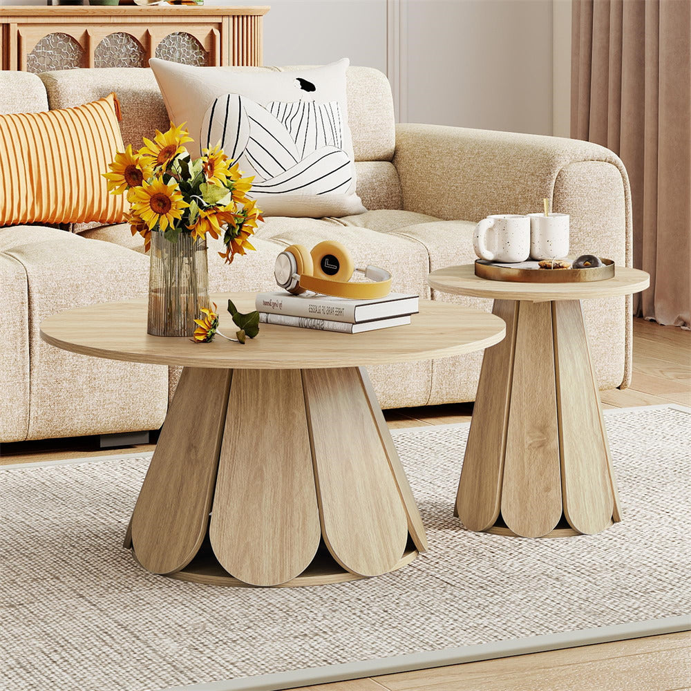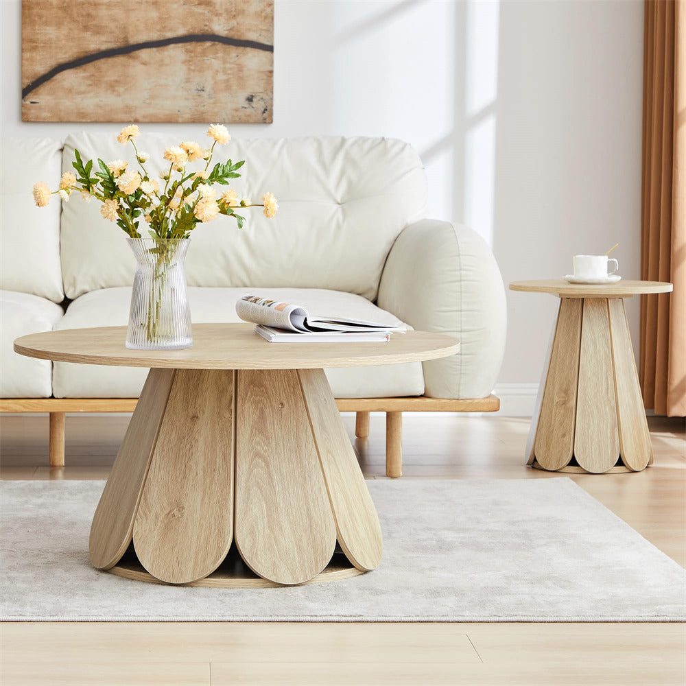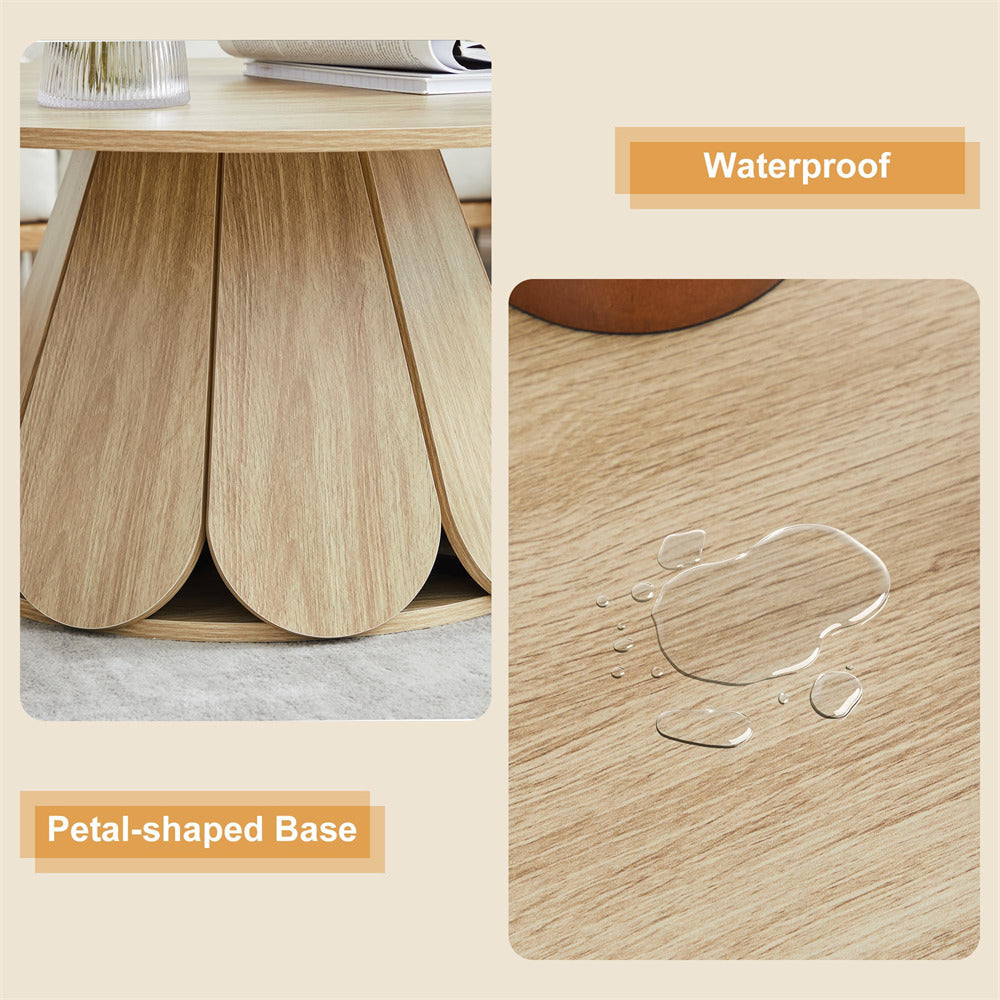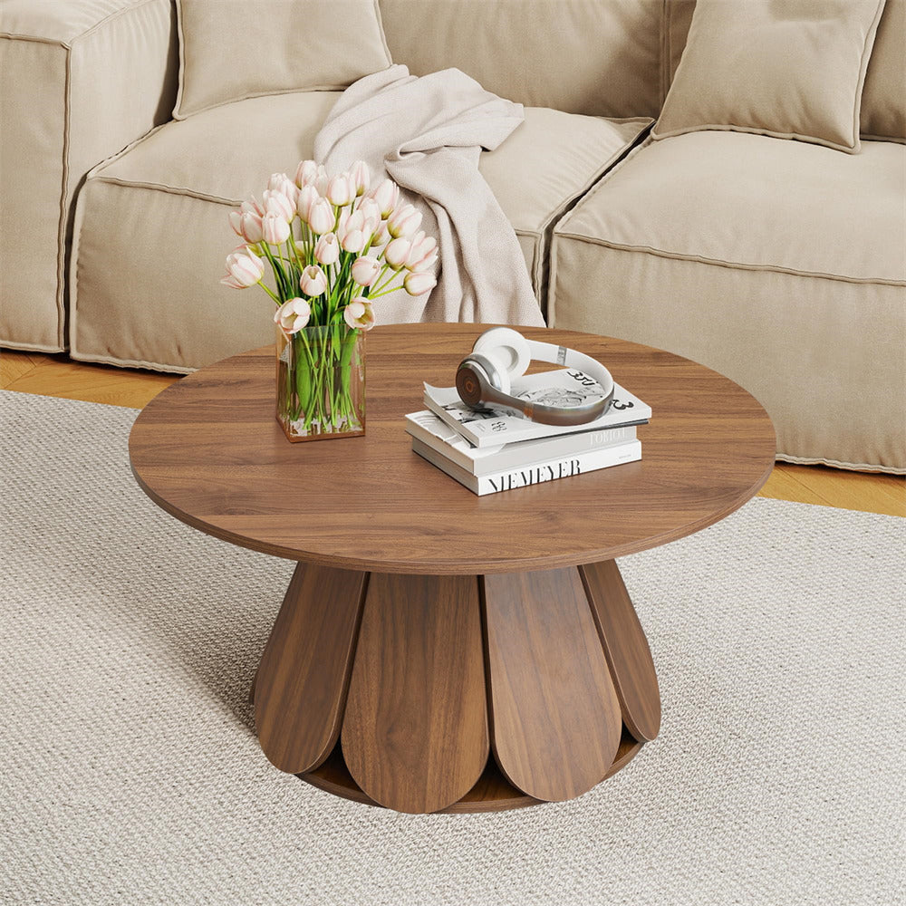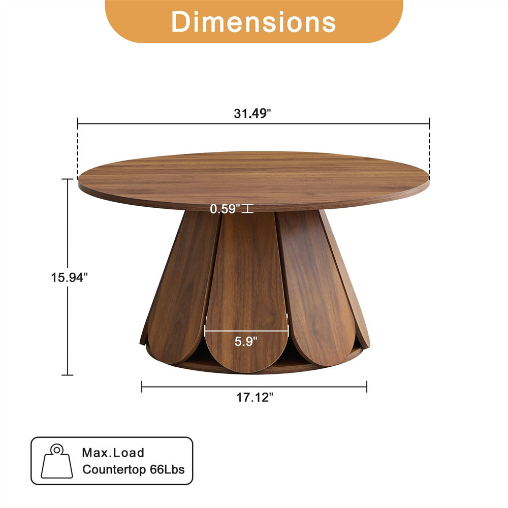 Elegant Coffee Table: Boasting a sleek, minimalist circular design with a striking petal-shaped table base, this modern rustic-inspired coffee table merges contemporary elegance with a warm, natural aesthetic. The substantial base offers steady and wobble-free support to the tabletop, lending overall sturdiness to the table.