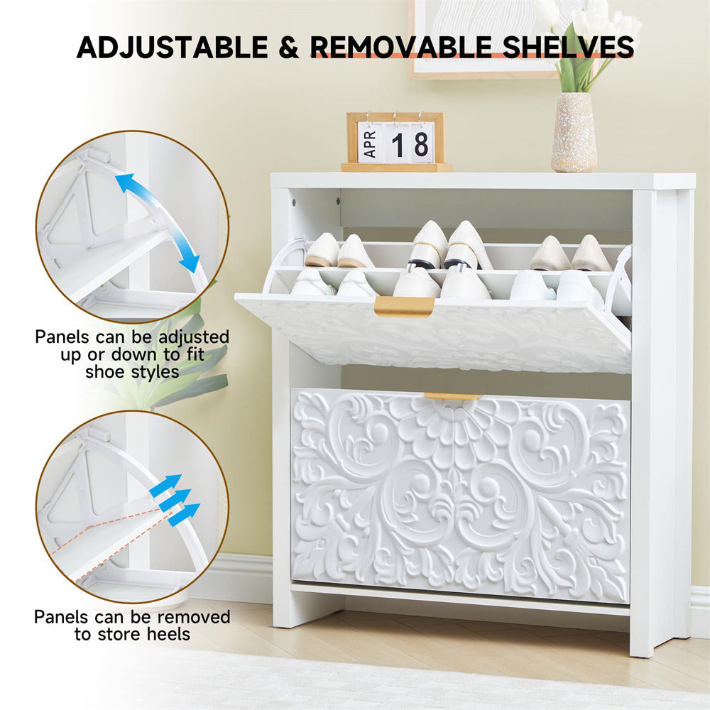 2-Tier Hidden Narrow Shoe Cabinet with Flip Drawers and Carved Floral