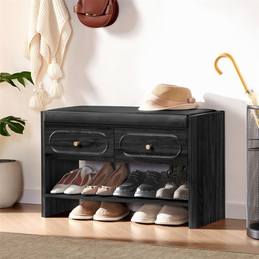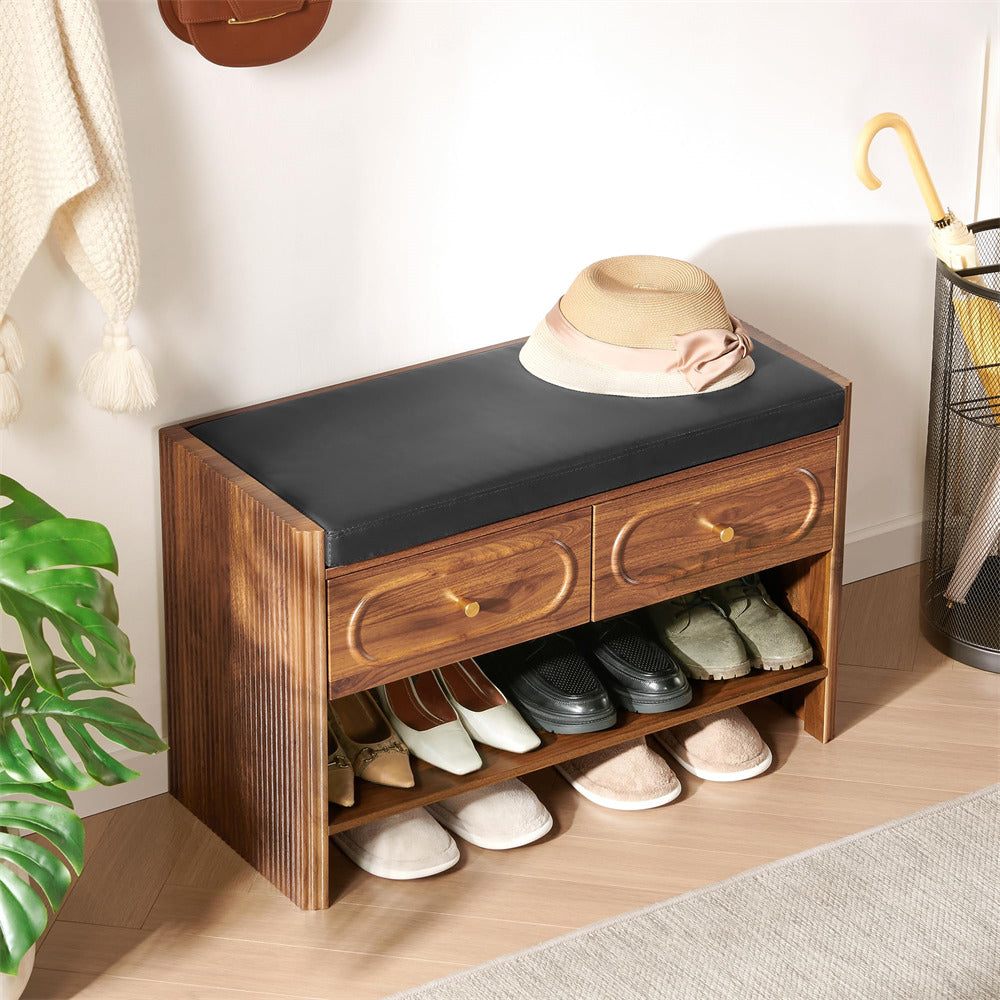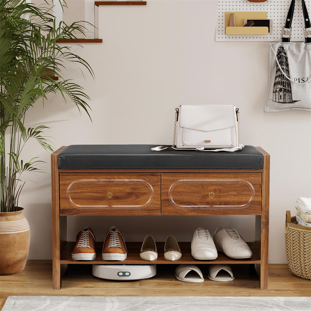 Efficient Shoe Bench: This storage bench combines 2 spacious drawers for categorized storage of small items like socks, keys, wallets, sunglasses, toys, or scarves, and an integrated shoe rack that neatly holds 6-8 pairs of shoes. Designed to maximize space efficiently, the wooden storage bench keeps your living area tidy while offering secure, multifunctional storage solutions.