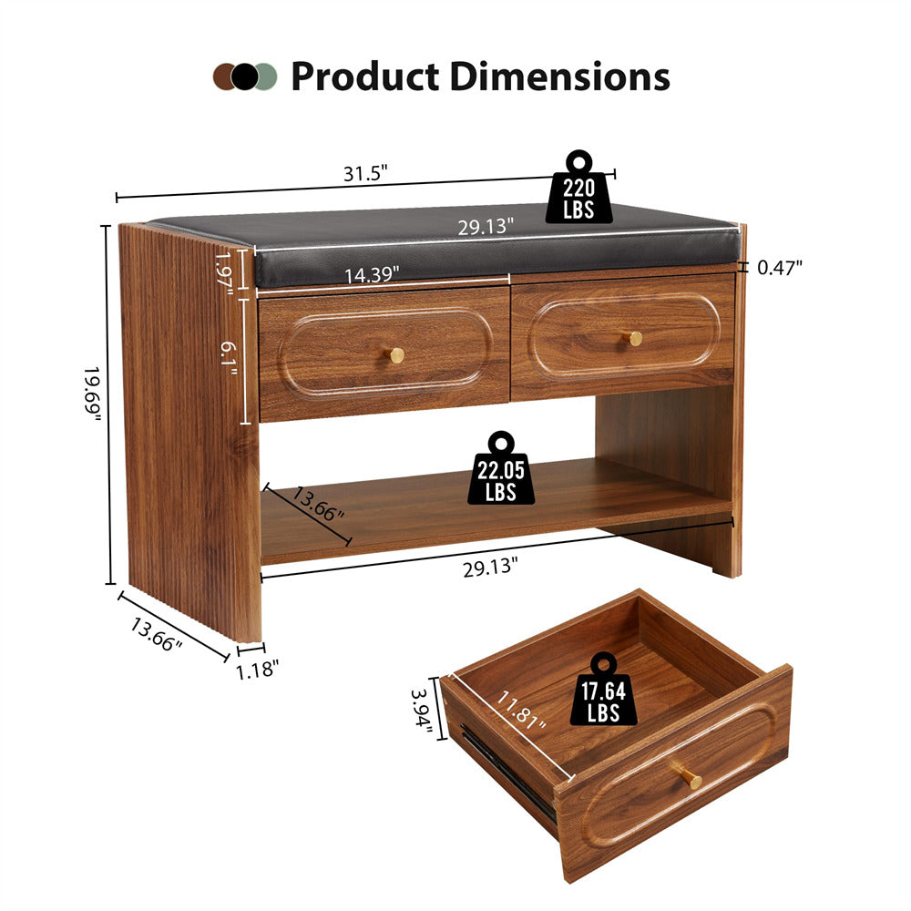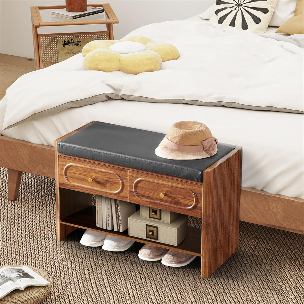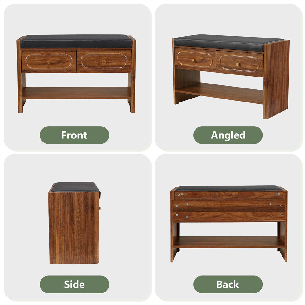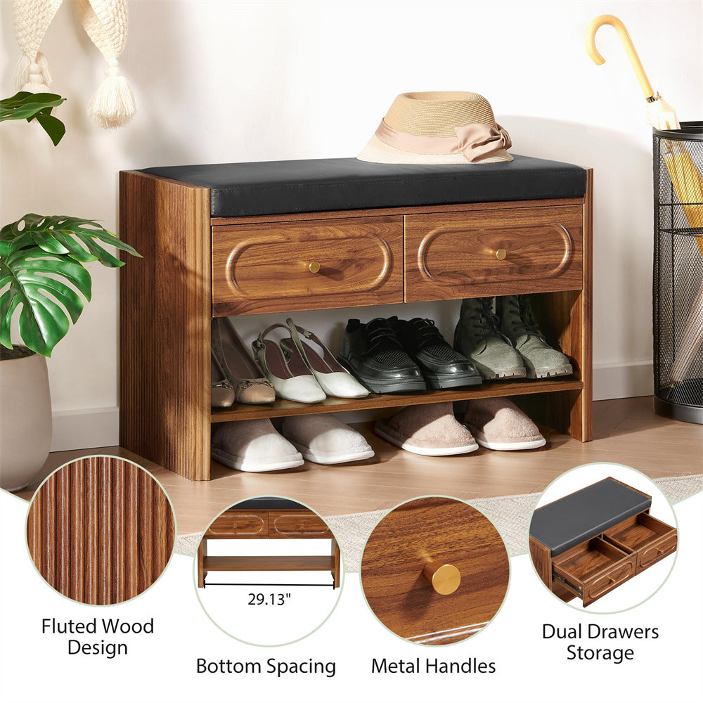Efficient Shoe Bench: This storage bench combines 2 spacious drawers for categorized storage of small items like socks, keys, wallets, sunglasses, toys, or scarves, and an integrated shoe rack that neatly holds 6-8 pairs of shoes. Designed to maximize space efficiently, the wooden storage bench keeps your living area tidy while offering secure, multifunctional storage solutions.
