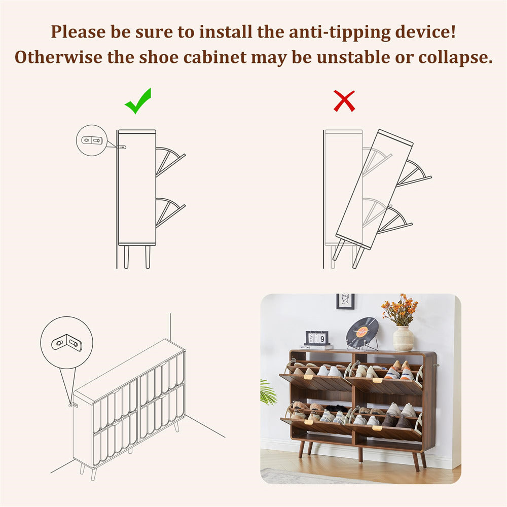 Durable and Sturdy: Invest in quality that lasts with our Durable and Sturdy Shoe Cabinet. Crafted from high-density MDF, this cabinet ensures long-lasting durability without compromising on style. The thoughtful arc design of the table corners ensures the safety of your pets and children. With an anti-dumping device included, rest assured that your child's safety is our priority. Elevate your space with confidence!