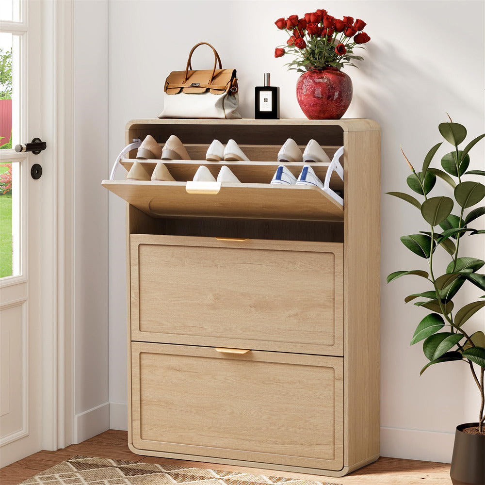 Total of 3 Storage Compartments - A desktop, three flip drawers. With a vase and books on the top table. The flip drawers are a great place to store shoes that you wear less often, or that you want to keep out of sight.