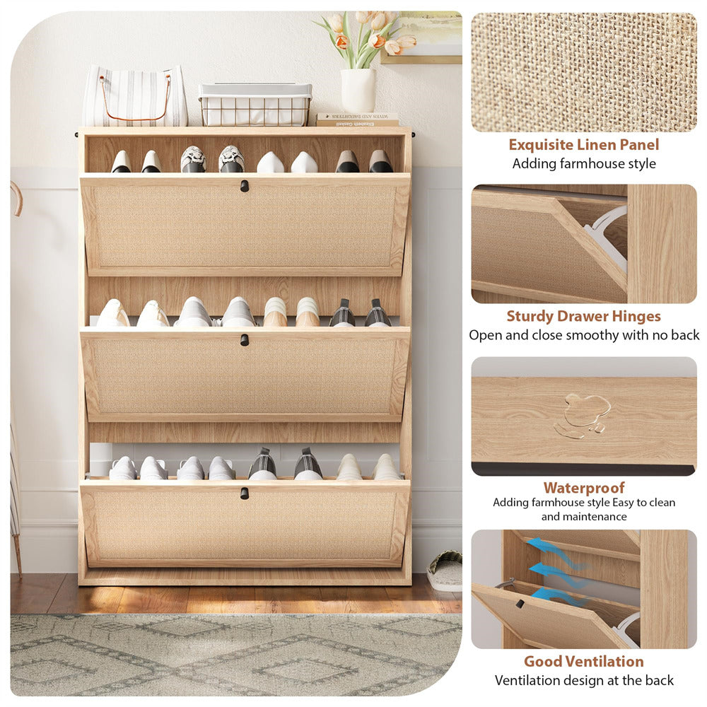 Farmhouse Stylish: With a charming farmhouse-inspired look, the flip drawer shoe cabinet blends seamlessly with rustic, modern, or transitional décor styles. The wood grain finish combined with linen fabric drawer fronts adds warmth and texture to your space. Perfectly complements your entryway or hallway while serving as a functional and decorative piece.