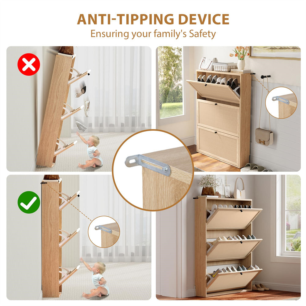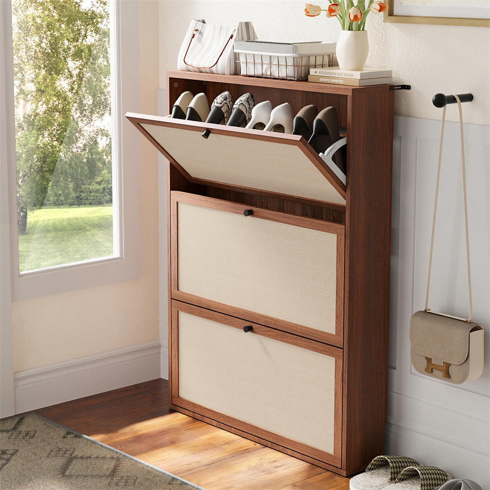 3 Flip Drawers Shoe Cabinet: Featuring 3 independent flip drawers, this narrow shoe cabinet allows easy access while maintaining a neat appearance. Each drawer is single-layer, leaving plenty of room for large shoes. Say goodbye to clutter—this space-saving design keeps your shoes clean, organized, and easily accessible.